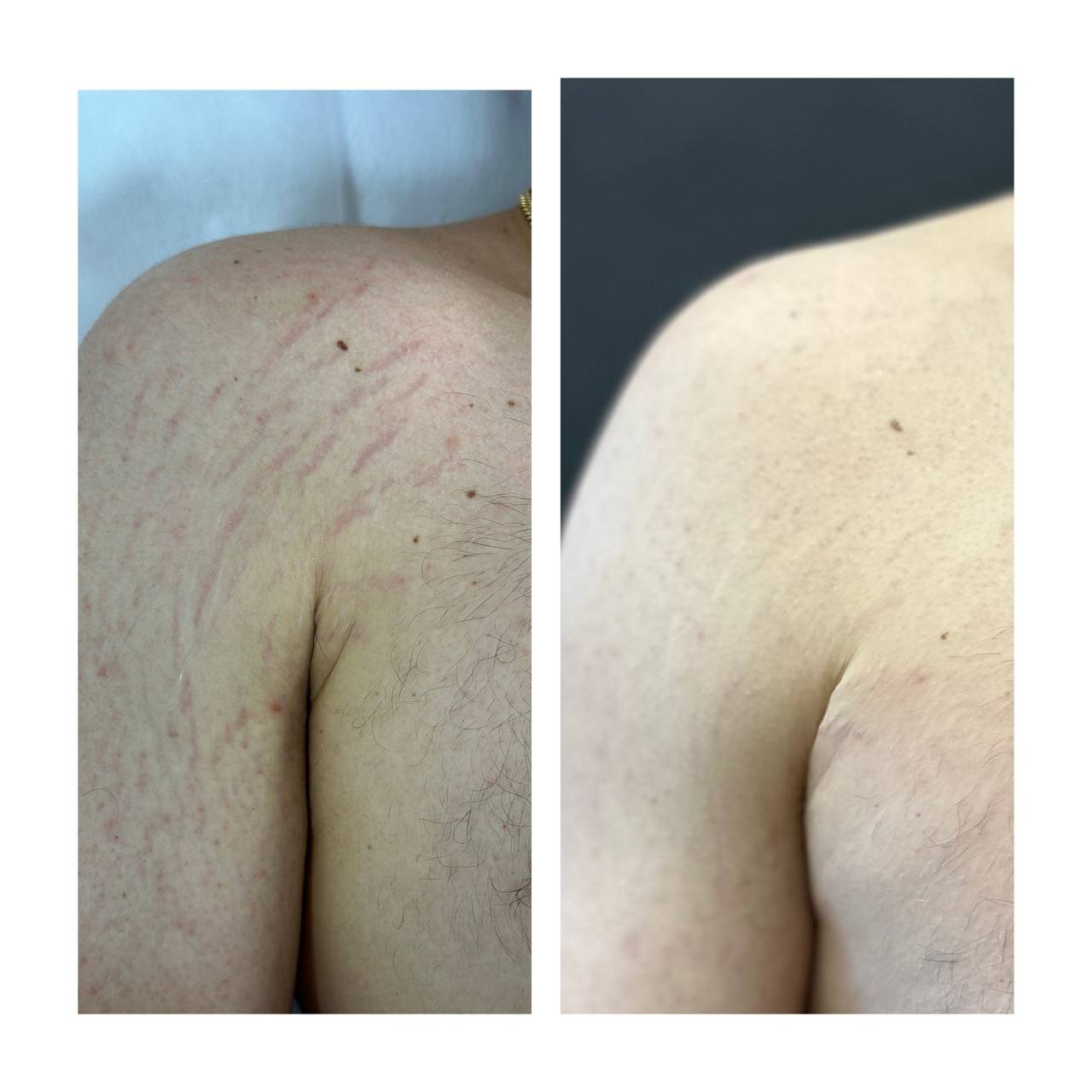 Во время каждого сеанса я наблюдала постепенное изменение структуры и внешнего вида стрий, что было подтверждено как клиническим анализом, так и с помощью фотопротоколов. Особенно ценным было то, что пациент отмечал заметные результаты лечения. Уже на третьем сеансе были заметны значительные изменения: