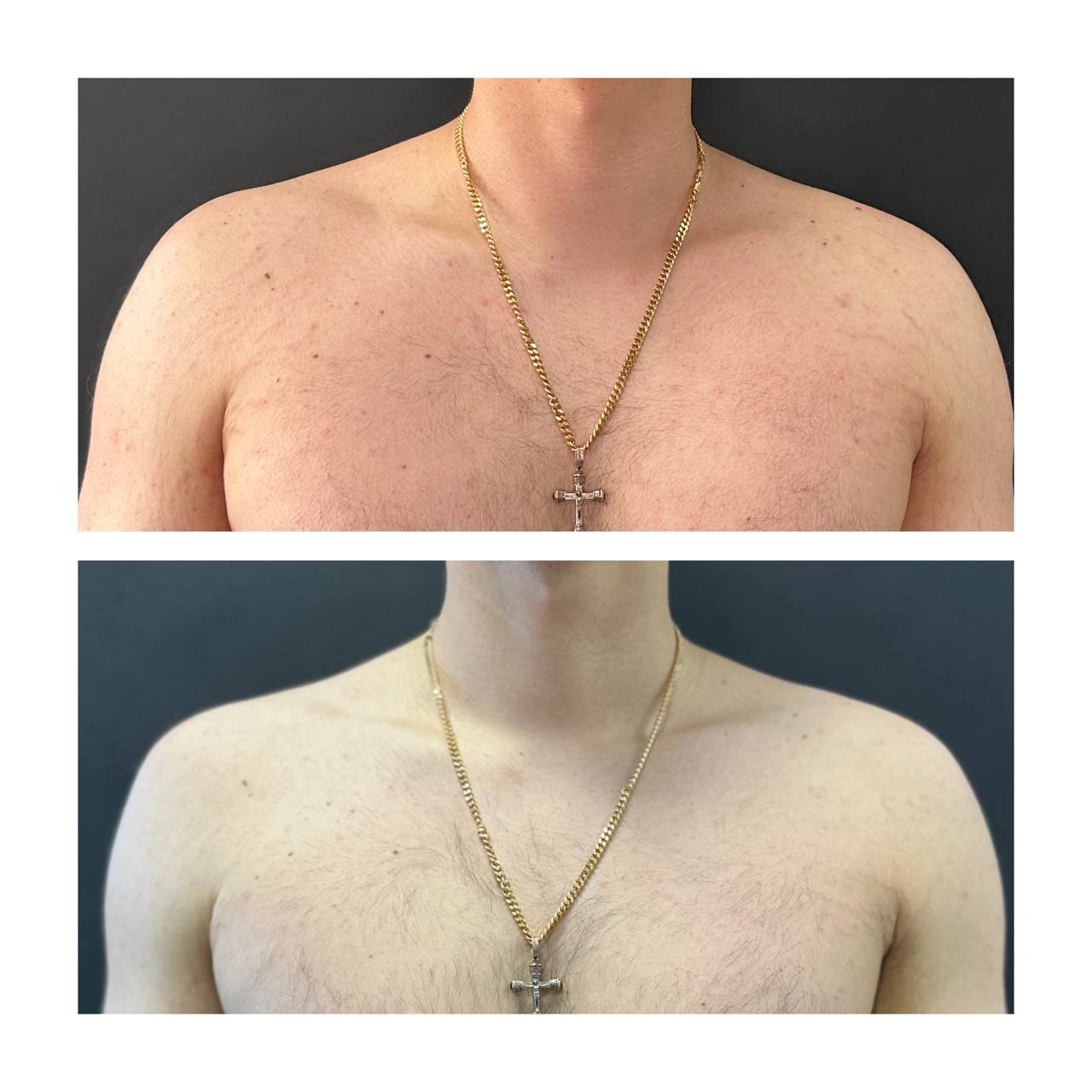 Один из моих кейсов касается лечения молодого пациента, парня 21 года. Растяжки появились у него в период активного роста в сочетании с интенсивными занятиями спортом и активным мышечным ростом. Проявлялись по-разному направленные полосы красного и белого цвета, с различной степенью углубления и были ощутимы при прикосновении.