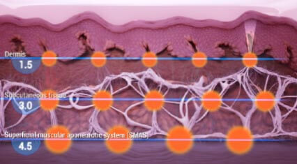 Ultherapy® доставляет энергию на три глубины (1,5, 3,0 и 4,5 мм)1,7