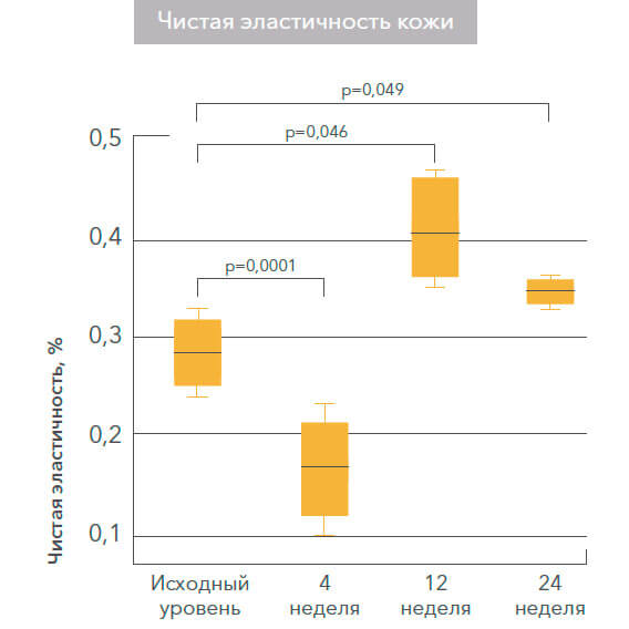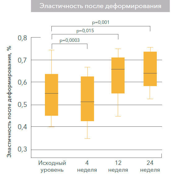 Изменения эластичности кожи : исходный показатель по сравнению с 4, 12 и 24 неделями после однократного лечения MFU-V: (A) чистая эластичность кожи и (B) эластичность после деформирования.