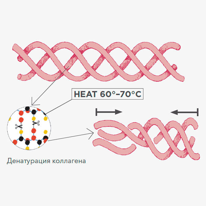 Фибриллы коллагена, при нагревании до определённой температуры в течение определённого периода времени – сжимаются, т.к. внутримолекулярные водородные связи в структуре коллагена разрываются13,23