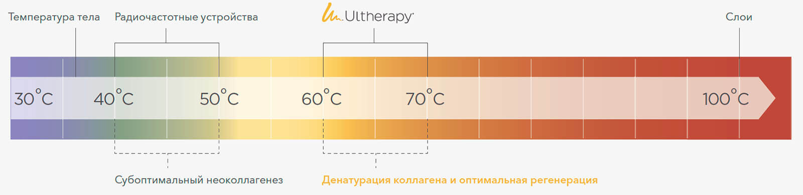 Ultherapy® постоянно достигает оптимальной температуры 60-70°C для инициирования неоколллагенеза1,5