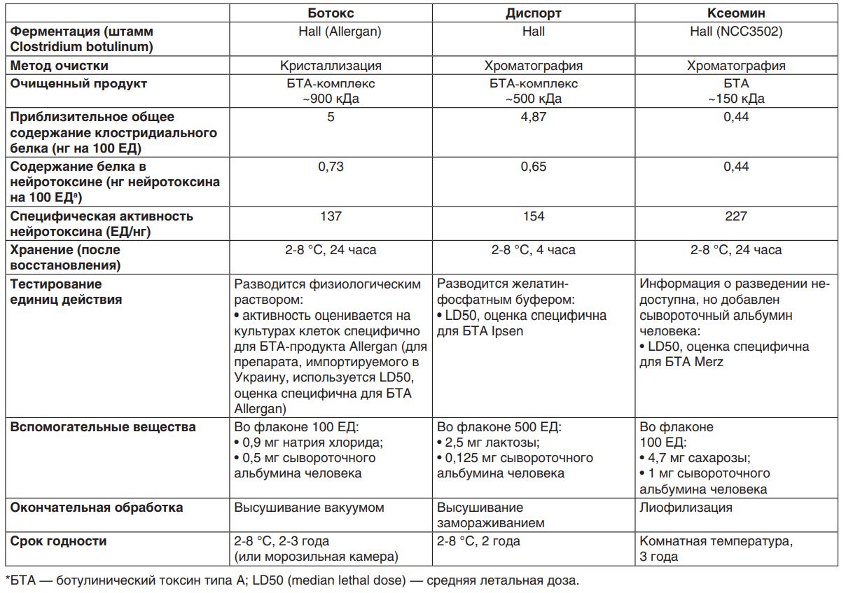 Перший препарат БТА (Botoks®, onabotulinumtoxinA, Allergan) був офіційно схвалений у США у 1989 році. З того часу за останні 30 років у світі були створені та зареєстровані інші препарати: Діспорт® (abobotulinumtoxinA, Ipsen, Франція); Ксеомін® (incobotulinumtoxinA, Merz Pharmaceuticals GmbH, Німеччина); Лантокс® (Lanzhou Institute of Biological Products, Китай не зареєстрований на території України); Релатокс® (ФГУПНВО «Мікроген», Росія – не зареєстрований на території України). Між цими препаратами ботулінічного токсину (БТ) існує безліч відмінностей, наприклад склад молекули токсину, ступінь його очищення, особливості виробничого процесу, температурний режим зберігання і тип або кількість допоміжних речовин, які містяться в кожному препараті.