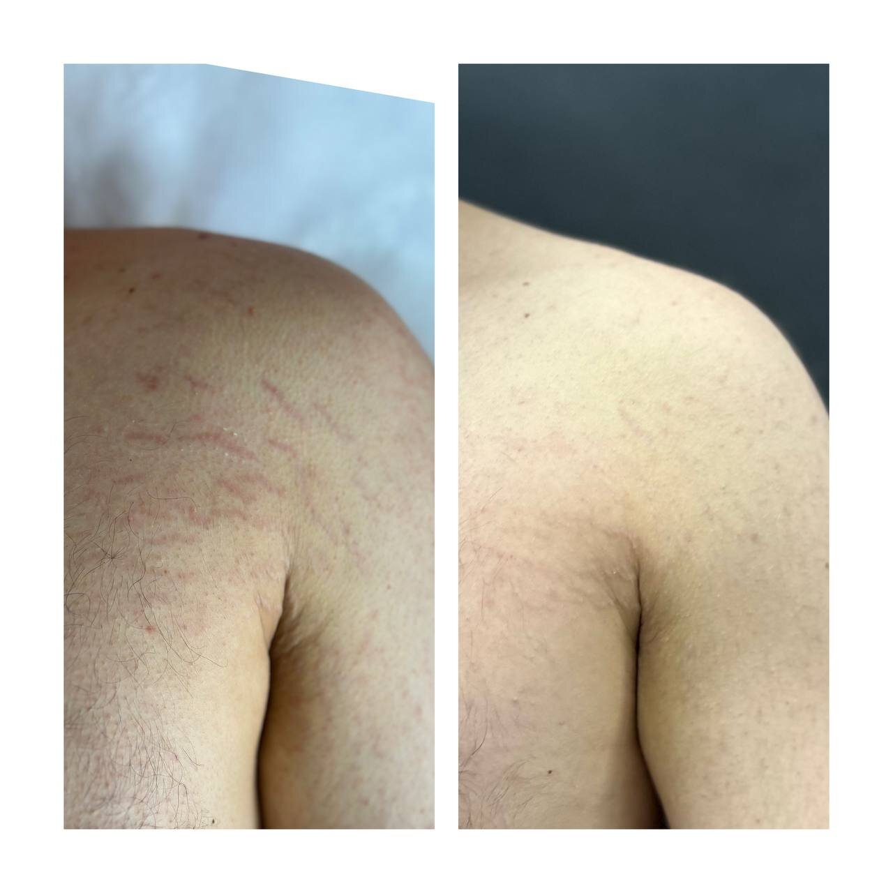 Один із моїх кейсів стосується лікування стрій у молодого пацієнта, хлопця 21 року. Розтяжки з’явилися у нього в період активного росту в поєднанні з інтенсивними заняттями спортом і активним нарощуванням м’язової маси. Проявлялися різнонаправленими смугами червоного та білого кольору та різного ступеня заглиблення та були відчутними на дотик.
