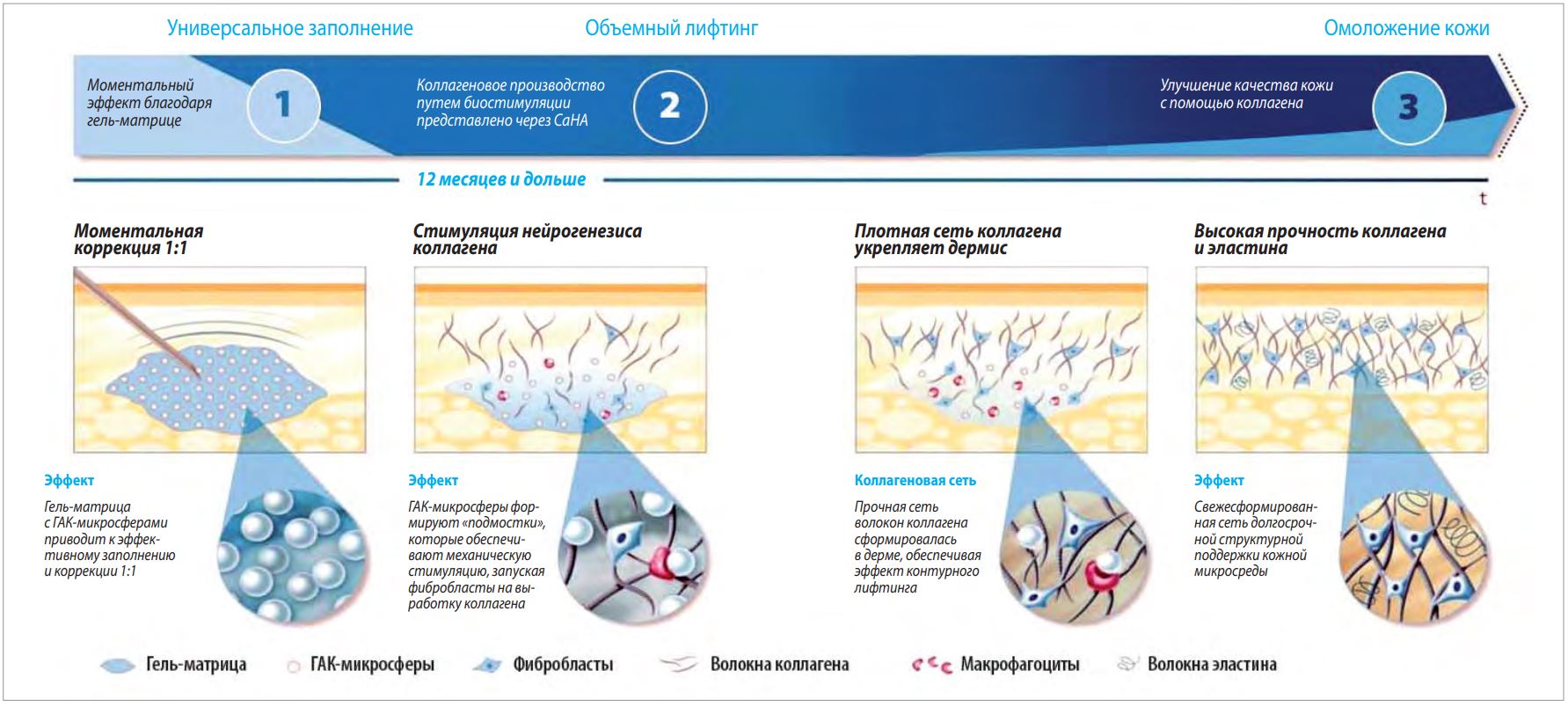 Тривалий ефект досягається поступово за рахунок формування нових тканин через неоколагеногенез - вироблення колагену 3-го типу, що поступово конвертується в колаген типу 1, а також через вироблення еластину (покращує еластичність шкіри), стимуляцію проліферації клітин шкіри (зокрема, фібробластів) і ангіогенез ( формування нових судин шкіри) (рис. 2).
